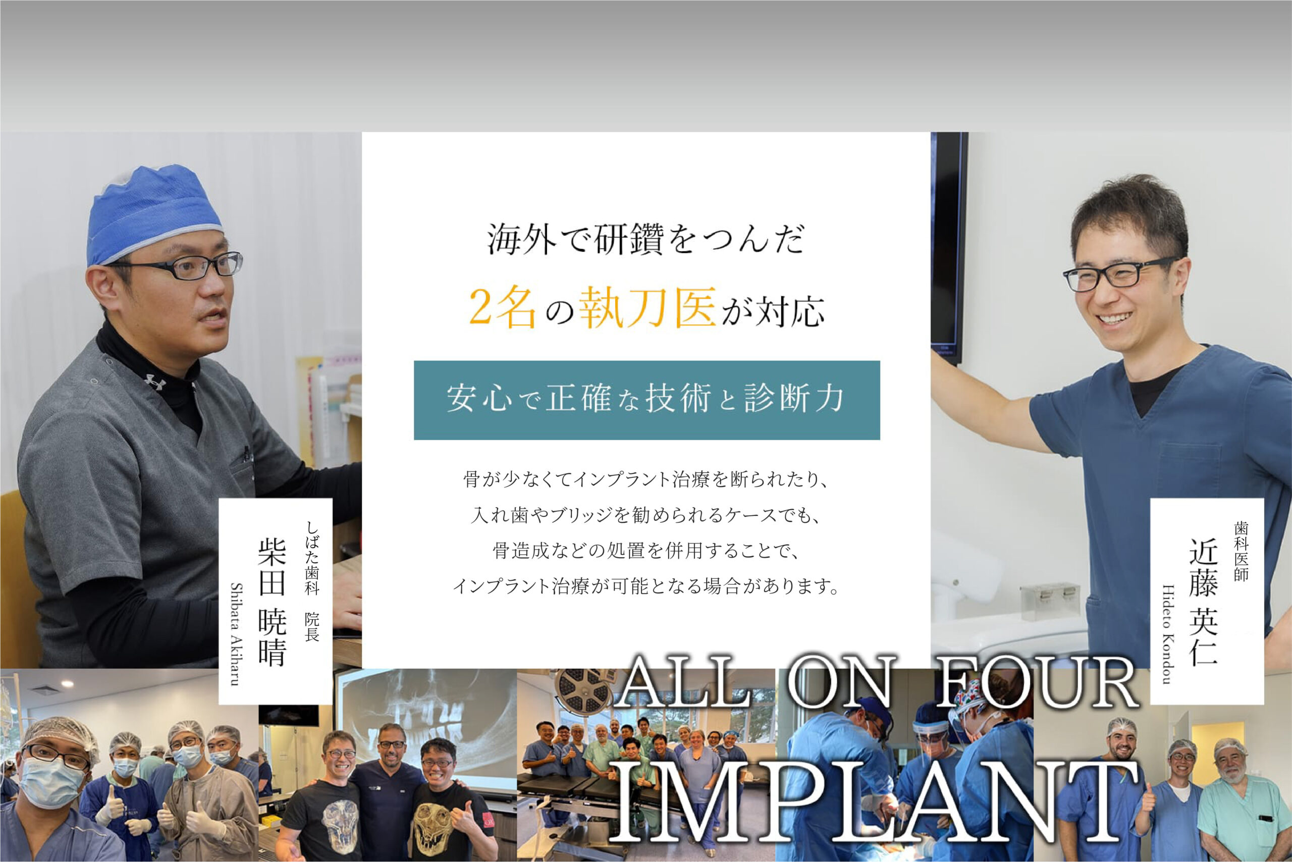 しかし、歯科医療技術の発展により最少4本のインプラント埋入で歯をしっかり補綴する治療法「オールオン4(All-on-4)」が開発され、治療の負担を必要最低限に抑えることができるようになりました。